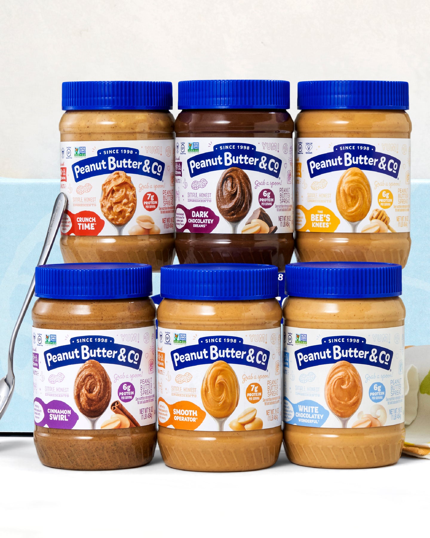 Each box container 6 jars of Peanut Butter & Co products, and you can choose each one from the list provided. We'll also include a tea towel and our famous spoon engraved with the words "My Peanut Butter Spoon."